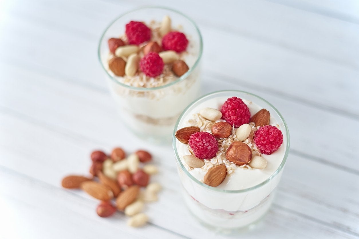 3 cups plain Greek Yogurt 3 cups of fresh berries of your choice. We recommend blueberries, strawberries and raspberries. Frozen berries can also work. 4 tablespoons sliced almonds