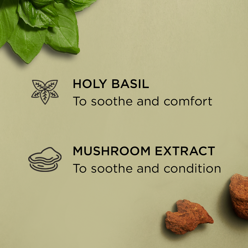 Soothe and alleviate irritated skin with comforting plant-derived adaptogens like holy basil and mushroom extract.
