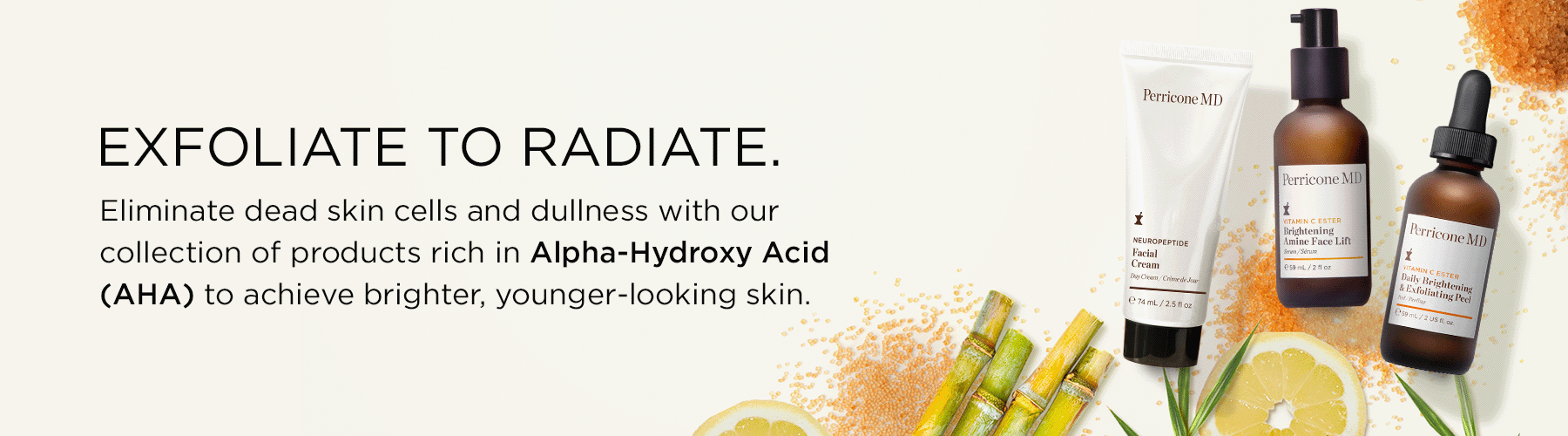 Alpha-Hydroxy Acids (AHA), organic acids often found in plants, exfoliate and hydrate for brighter, younger-looking skin over time. They easily penetrate skin’s surface to help eliminate dead cells and offer an alternative to harsh physical exfoliants.